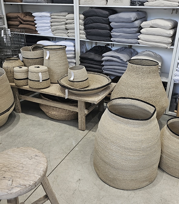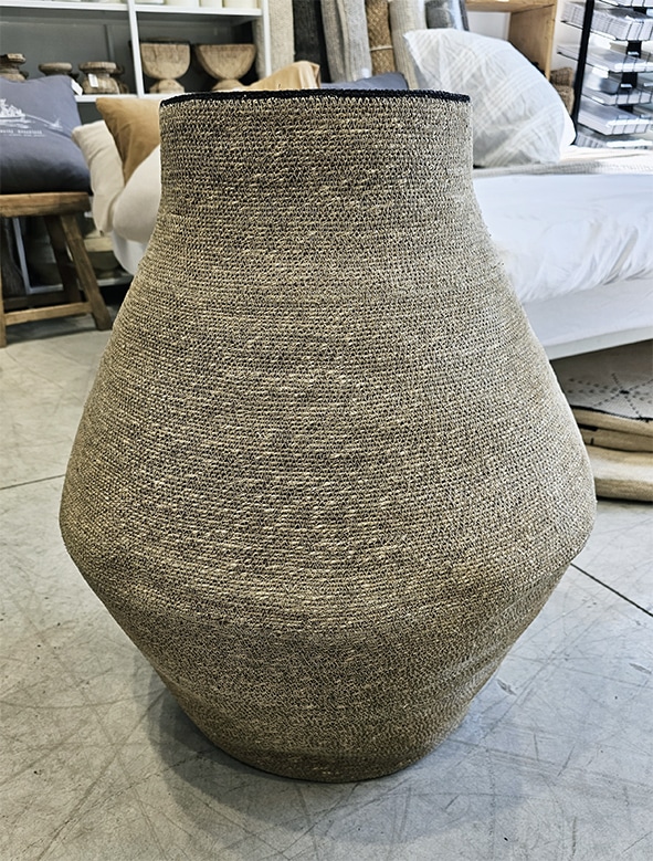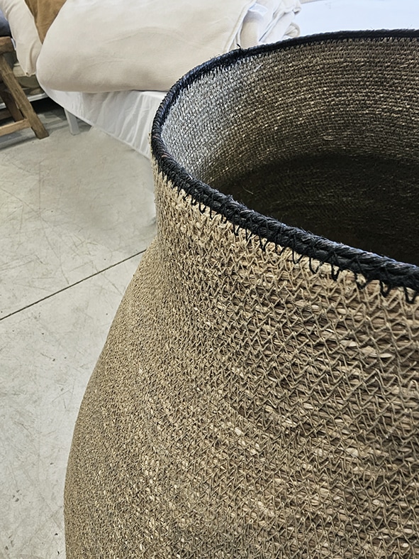 כד רקום XL בעל נוכחות מרשימה, קלוע בעבודת יד, פס שחור מעטר את הקצה העליון של הסל.