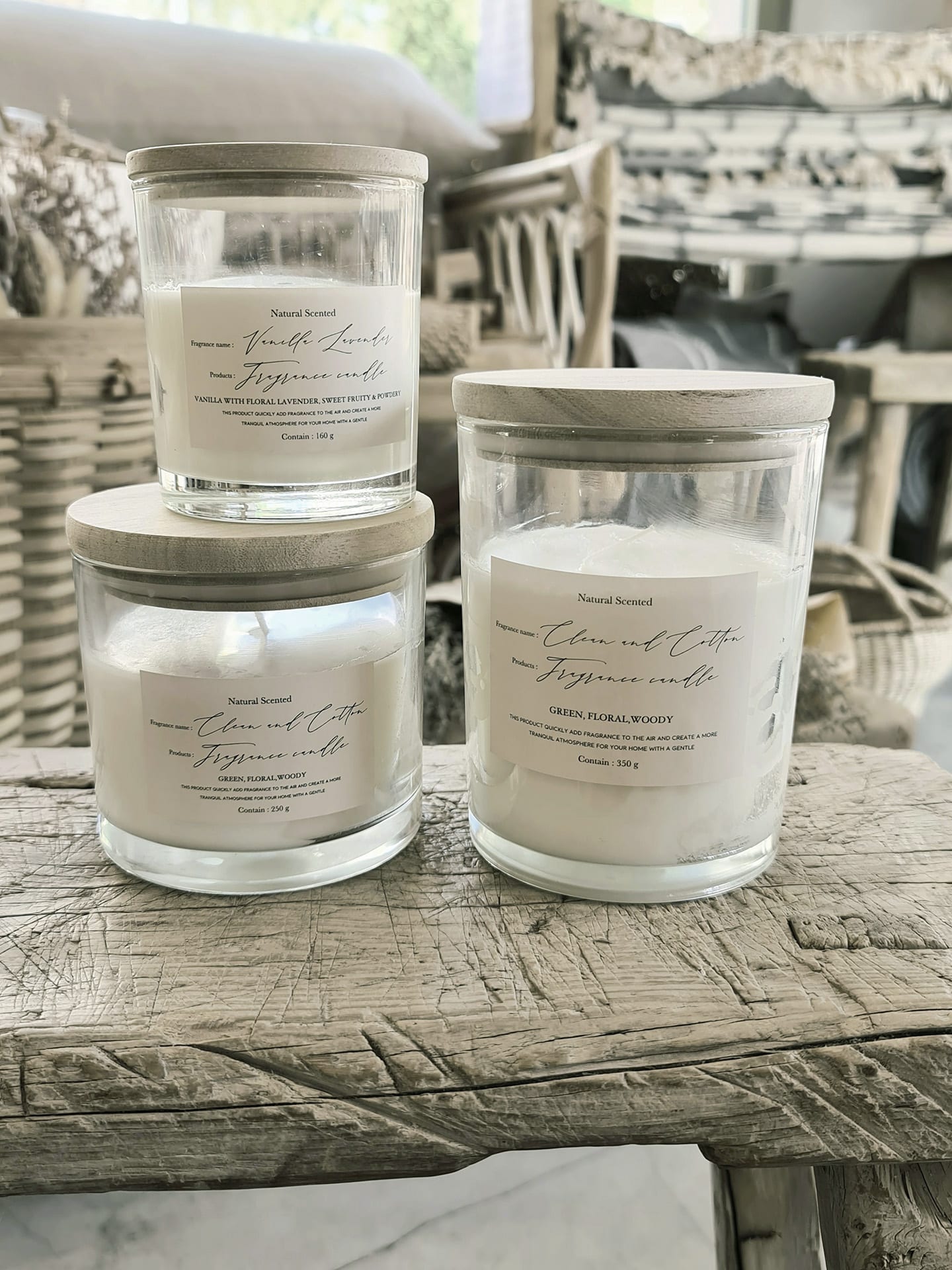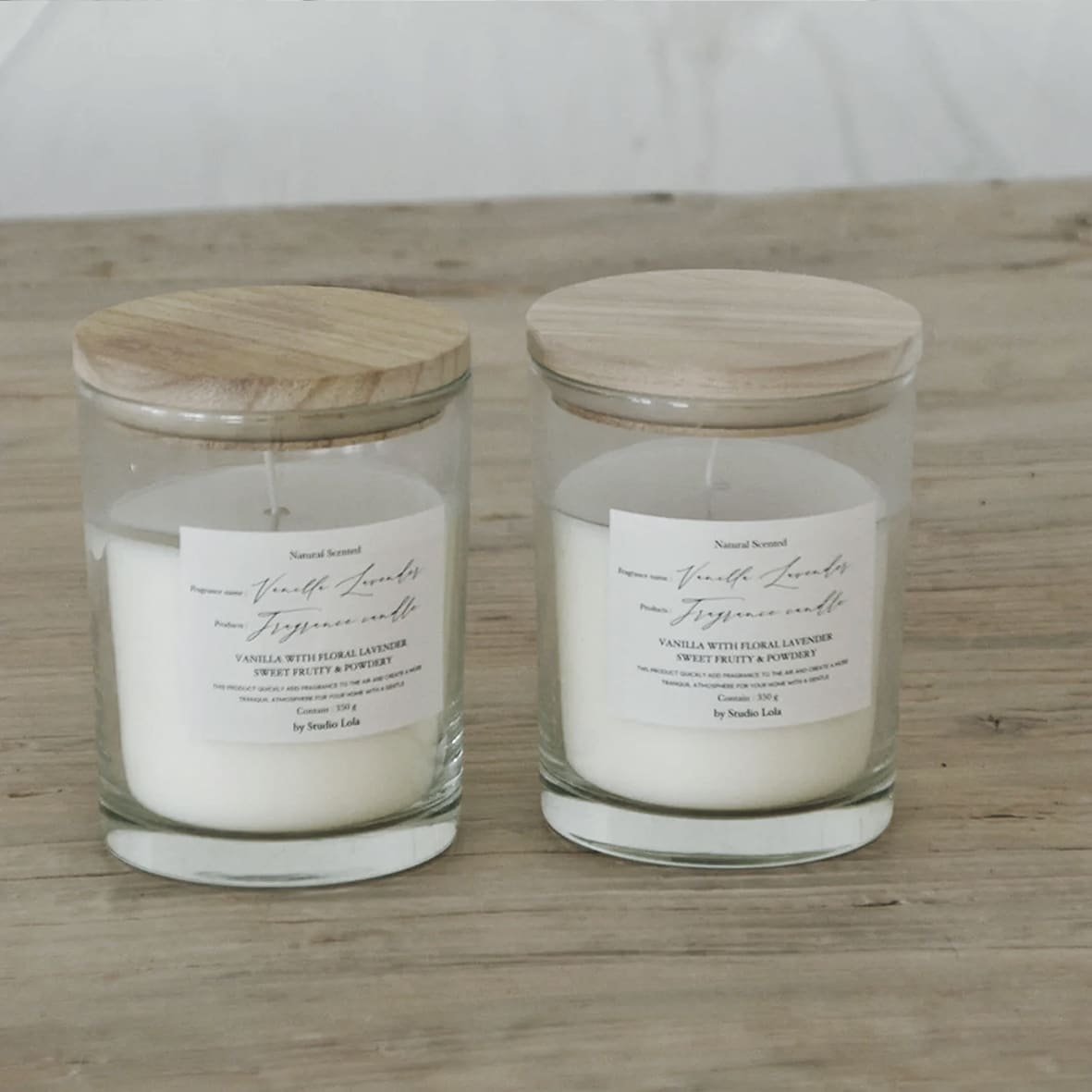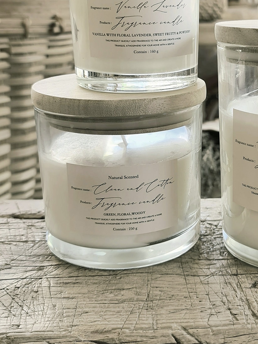 נר מכסה L ריחני יצוק בכוס זכוכית שקופה עם מכסה עץ פאולוניה בהיר